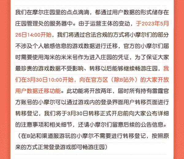 合作结束本就是开发方和代理方双方的事情,,,降低这件事情对玩家的影响,,,才是对所有珍视这段童年的摩尔玩家最好的呵护。。。目前看来,,,,用户完全不用担心后续因无法登录游戏而造成任何数据上的损失,,,只要及时进行账号转移,,就可以好好保留、、延续在庄园的痕迹和回忆,,,,继续在庄园里做快乐的红鼻子小鼹鼠。。。。