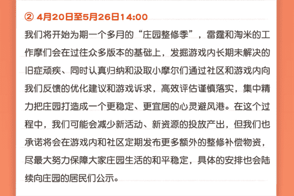 合作的结束并不意味着这个童年IP的结束,,对于《摩尔庄园》手游而言,,这是一个新阶段的开始。。。后续游戏内将开启庄园重构计划,,,会就以往遗留下来的BUG进行集中修复,,,,并在游戏内和社区定期发布更多补偿物资。。。。