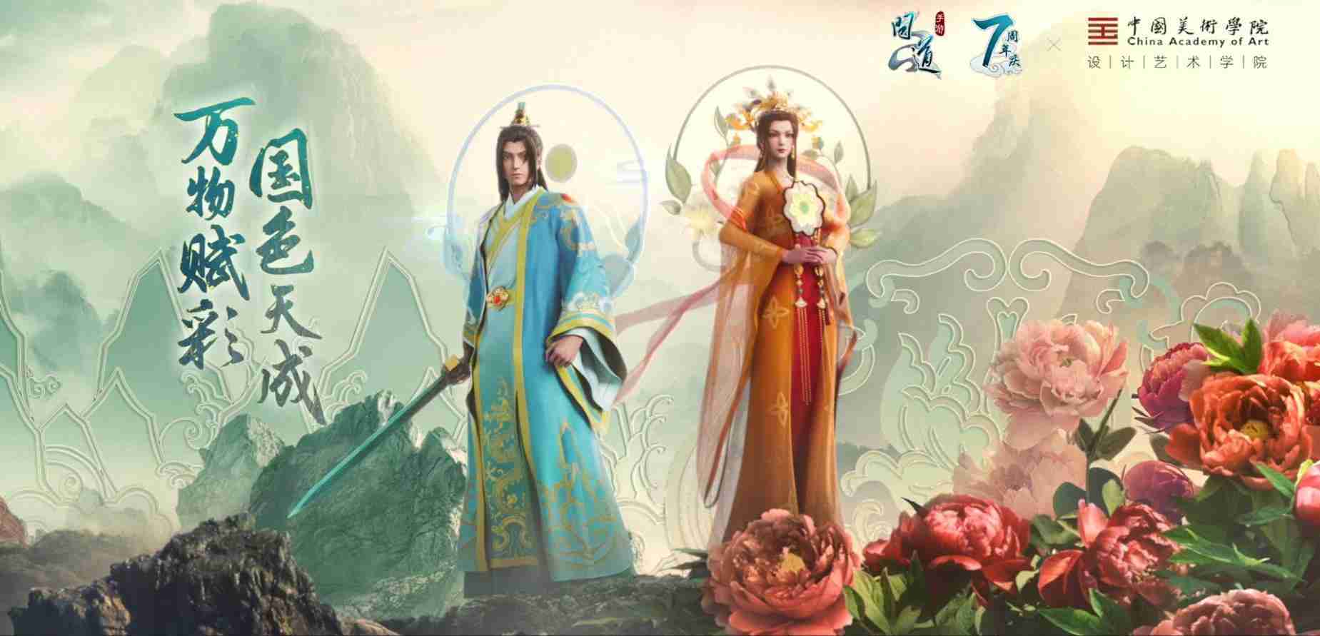 2023年4月,,,,《问道手游》联动中国美术学院,,,,在游戏中融合了中国历史上不同时期的文化元素,,,,打造了“山河万象”与“凤鸣九霄”的国风时装。。。。在色彩配置方面,,,创作团队基于对游戏角色特性的分析提取相应的文化内涵,,从每一种色彩的色相、、指代事物和情感出发对应角色属性,,选定服装的色彩搭配。。。。在纹样设计方面,,,,创作团队结合游戏角色自身特殊的造型比例和形态,,,在实际的纹样设计中进行了游戏语境下的活化演绎。。男性角色集中使用了如蟒纹、、、、海水江崖纹、、如意纹和云气纹等传统纹样元素,,女性角色则吸纳了凤凰纹、、、、牡丹纹、、卷草缠枝纹等元素,,组成以“双凤牡丹纹样”“缠枝牡丹纹”“金玉凤冠头饰”为主要纹样的游戏角色装饰图案系统。。。