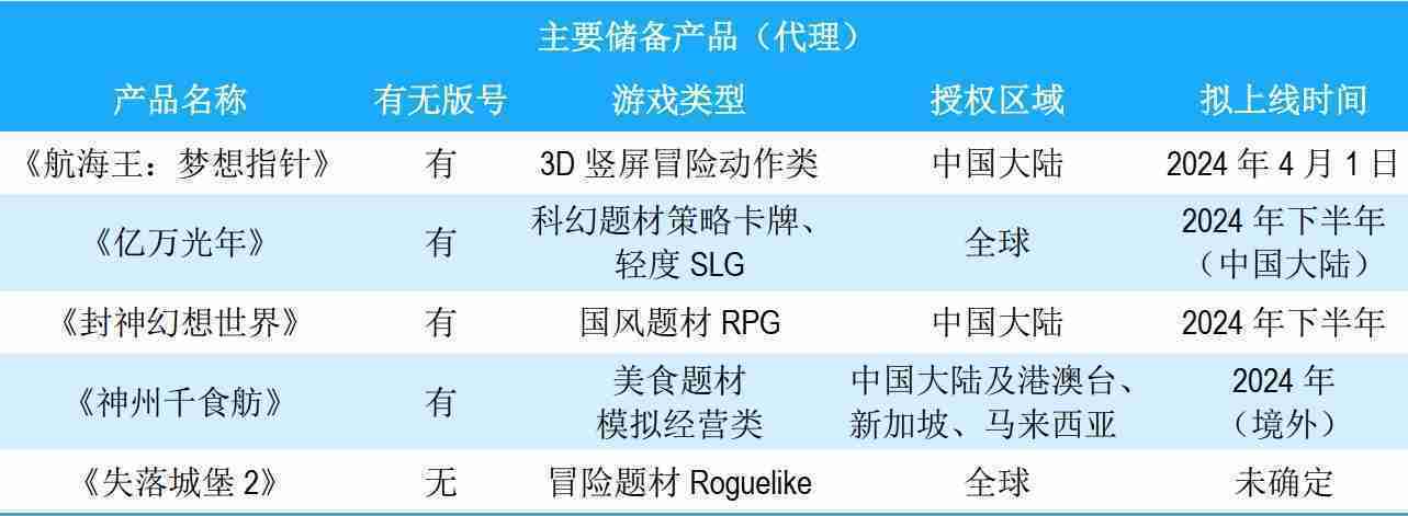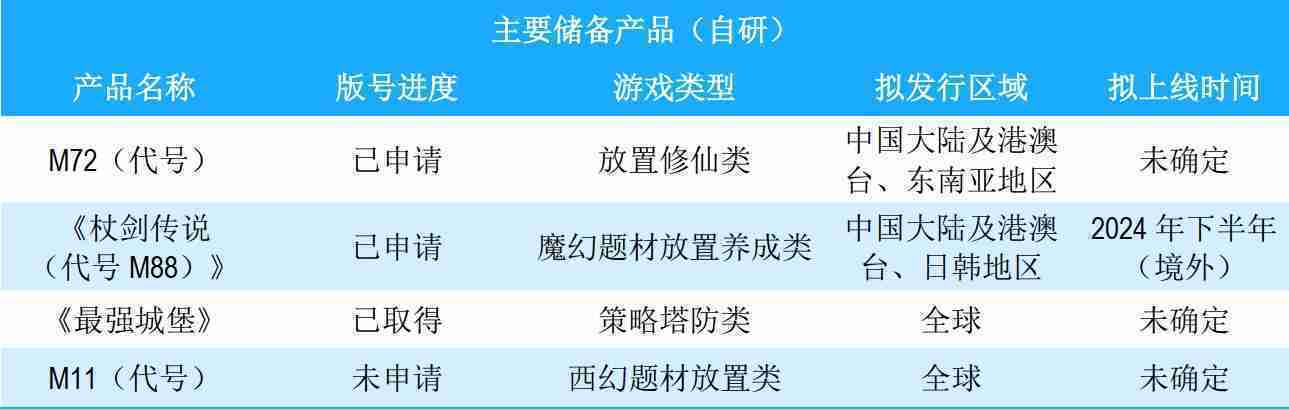 公司储备的多个自研、、、代理产品都在有序推进当中,,涵盖放置类、、、策略类、、、模拟经营类、、、RPG、、、、Roguelike等多元化游戏品类,,,,储备的主要自研和代理产品如下:::